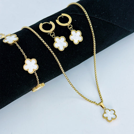 View full detailsDescribe: Product name: Wholesale 5-piece set of five-petal flower necklace, bracelet, bangle, earrings, and ring Material: zircon Weight: 30g ...